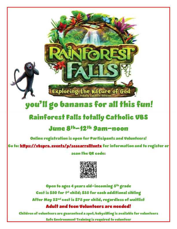 Volunteers –One way to share your talents is to teach sessions. All lesson plans and materials are provided. A tuition discount is offered for families who volunteer to teach. Less demanding volunteer opportunities include being a substitute teacher, helping with enrichment sessions, material preparations, door monitors, etc. To keep our children protected, all volunteers must attend Safe Environment training. If you are interested in volunteering, please email Karen Hines at khines@stcatherine.org.